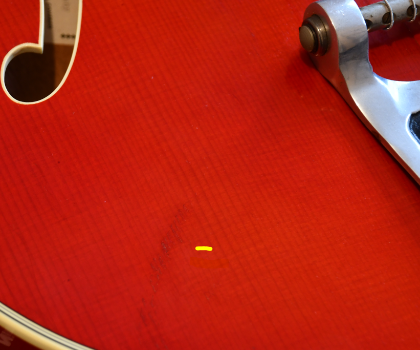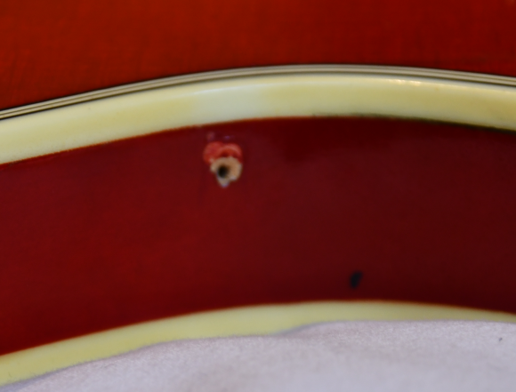 9 This is fairly evident, but in the playing underside. This is the screw hole where the pick guard was screwed in to originally, long since removed.
