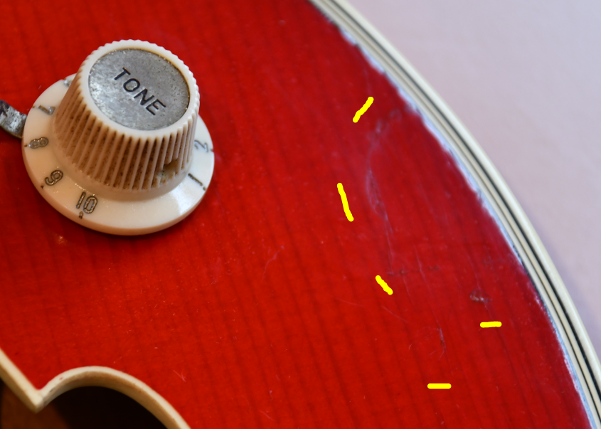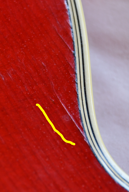 7 There is some minor cracks in the veneer at one point, typical of type at this age. Elsewhere, there is some visibility of the veneer lines, but this is very minor, and in comparison with other models of this age, not a material detraction to the guitar.