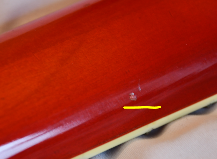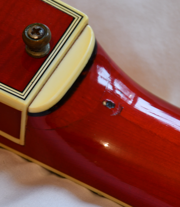 3 There is some loss of varnish on the top of the headstock where is must have been knocked at some point, and minor blemishes on the right edge.